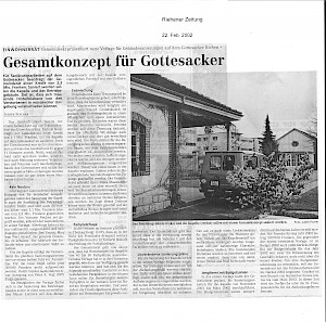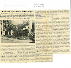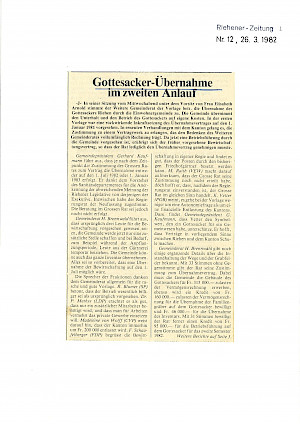 Am 24. März 1982 stimmte der Riehener Gemeinderat einer Vorlage zu, die die Übernahme des Gottesackers, der bisher dem Kanton gehört hatte, durch die Einwohnergemeinde regelte. Im Kontext der seit den 1960er-Jahren breit abgestützten Autonomiebestrebungen der Gemeinde Riehen wurde den Übernahmeverträgen ein hoher symbolischer Wert beigemessen. So hoffte etwa der damalige Gemeindepräsident Gerhard Kaufmann, «dass Verträge im vorliegenden Sinne zwischen Riehen und dem Kanton Schule machen» würden, wie die ‹Riehener Zeitung› vom 26. März 1982 festhielt.