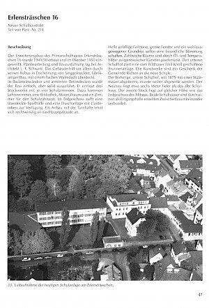 Das 1878/79 errichtete Primarschulhaus am Erlensträsschen 8 konnte im 20. Jahrhundert trotz Dachstockaufbau von 1922 nicht mehr alle Schulkinder fassen, weshalb bereits vor dem Zweiten Weltkrieg ein Erweiterungsbau des Architekten L. F. Schwarz in Planung war. Dieser konnte jedoch wegen der während des Kriegs rationierten Zementzuteilungen erst 1949/50 realisiert und im Oktober 1950 eingeweiht werden. Das langgestreckte Gebäude mit flachem Walmdach und grossen Fenstern umfasst drei Stockwerke mit je vier Schulzimmern, ausserdem ein Lehrerzimmer, eine Bibliothek, einen Materialraum und ein Zimmer für den Schulzahnarzt. Auf dem Areal befinden sich zudem eine überdachte Spielhalle, eine Turnhalle und eine Duschanlage mit Garderoben.