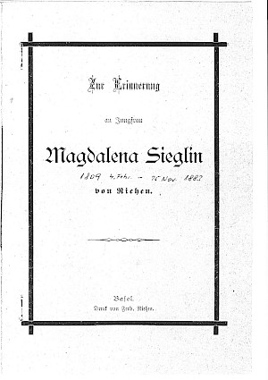 Zur Erinnerung an Jungfrau Magdalena Sieglin von Riehen. Basel 1883 (Leichenrede).